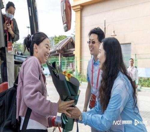 今日上午9时许,来自浙江的运动员代表团率先抵达,成为运动员酒店第一支入住队伍。十五运会网球竞委会新闻广电宣传处、行政接待处副处长张文骥联同竞委会一众代表以及可爱的十五运会吉祥物“喜洋洋”“乐融融”,在运动员酒店外喜迎代表队并献上鲜花,以东道主的热情欢迎运动健儿们的到来。