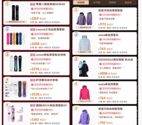 在今年某购物平台“双十一”的滑雪装备热销榜中,滑雪板与滑雪服位列最受欢迎的前十名,成为大众消费的热点。目前,滑雪板的普遍价格在2000元左右,而滑雪服则多在500至1000元区间。
