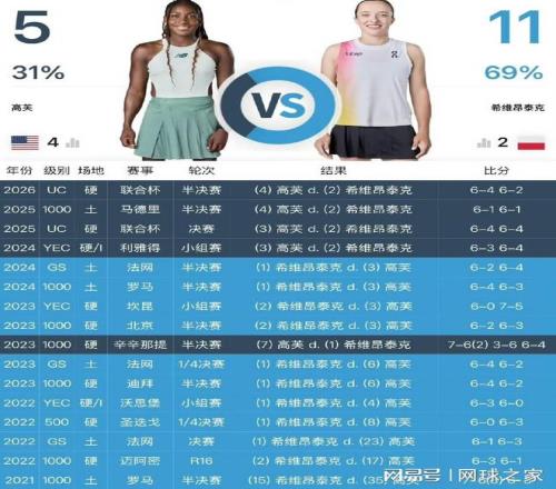 联合杯团体赛半决赛,斯瓦泰克意外遭高芙横扫,黑脸握手后,强忍泪水,在团队搀扶下才勉强走出赛场。这位前世界第一自前年的利雅得年终总决赛后,已经吞下了对高芙的四连败,如今的这一败,已经将双方的交手纪录改写为11胜5负。