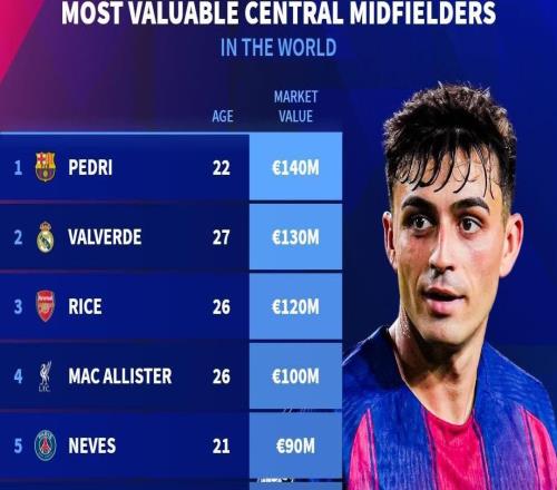 在完成最新一次身价更新后,德国转会市场网站列出了世界足坛中前卫身价榜,佩德里以1.4亿欧居首,巴尔韦德以1.3亿...