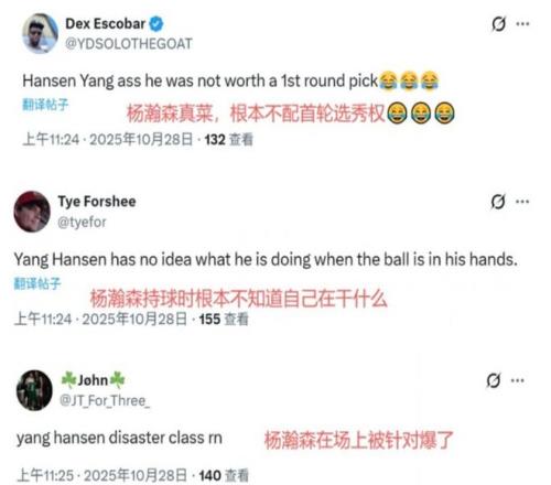 这场比赛结束后,不少美国网友抨击杨瀚森,他们犀利留言吐槽:杨瀚森的表现真的菜,他根本就不配首轮选秀权。他在持球之际根本不知道自己在干什么,他在场上被对手一五挡拆针对爆了。