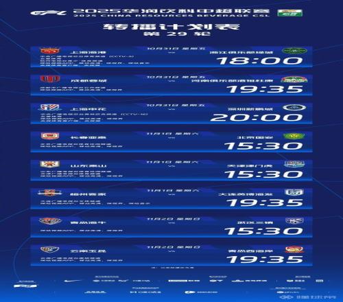与上一轮相同,争冠的三支球队比赛安排在同一天进行,上海申花队将在主场迎来 “老冤家” 深圳新鹏城队。海港率先登场亮相,紧接着是成都蓉城和申花。具体赛程如下:10 月 31 日 18 点,海港于主场迎战浙江队;19 点 35 分,成都蓉城在主场对阵河南队;20 点,申花于主场迎来深圳新鹏城的挑战。