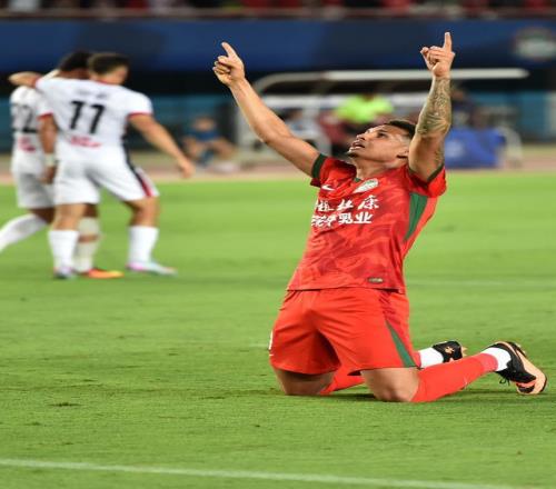 6月14日,河南俱乐部酒祖杜康队球员费利佩·卡多索在比赛中庆祝进球。 当日,在河南郑州举行的2025赛季中国足球超级联赛第14轮比赛中,河南俱乐部酒祖杜康队主场3比2战胜成都蓉城队。 新华社 发