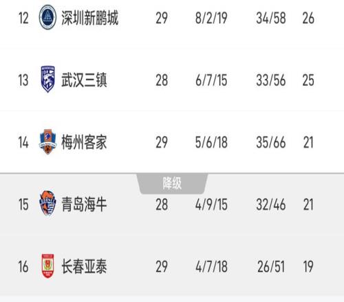 在本轮中虽然新鹏城不敌申花,三镇vs海牛的比赛还未进行,但随着亚泰输球、梅州战平,新鹏城和三镇分别高出降级区5分和4分。
