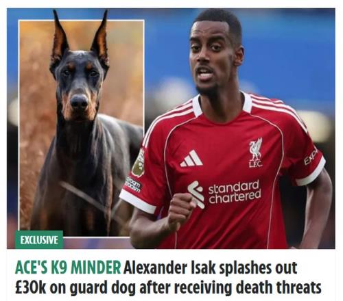 26岁的伊萨克,今年夏天从纽卡加盟利物浦,转会费高达1.45亿欧元(1.3亿英镑),是英超历史标王。11月22日,英国《太阳报》独家爆料,遭到死亡威胁的伊萨克,花3万英镑买下一只杜宾犬,守卫自己和家人的安全。