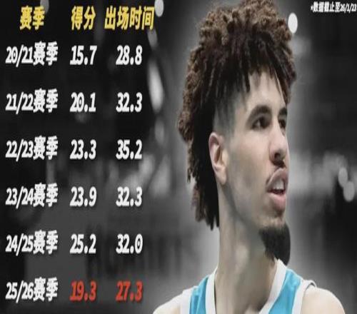 但24岁的拉梅洛-鲍尔,本赛季出场时间和得分都击穿了新秀赛季后的新低。